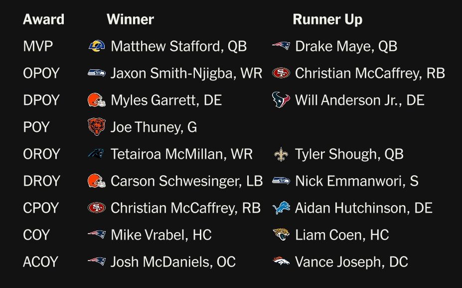 Un mariscal de campo ganó el MVP por decimotercer año consecutivo, y aunque Associated Press nomina a cinco finalistas, siempre será Stafford o Drake Maye. (Josh Allen, Trevor Lawrence y Christian McCaffrey fueron los otros).