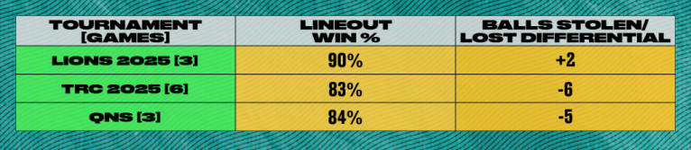 El desempeño máximo del lineout de los Wallaby se produjo durante la serie de los Lions, incluso con una segunda fila que no saltó (Will Skelton) comenzando en dos de los tres partidos. Australia ganó el 90% de su propio balón y pellizcó más de lo que cedió. Desde entonces, el lineout ha comenzado a tener algunas fugas y proporcionalmente está perdiendo más tiros propios y robando menos tiros del oponente que en cualquier otro momento de la temporada.