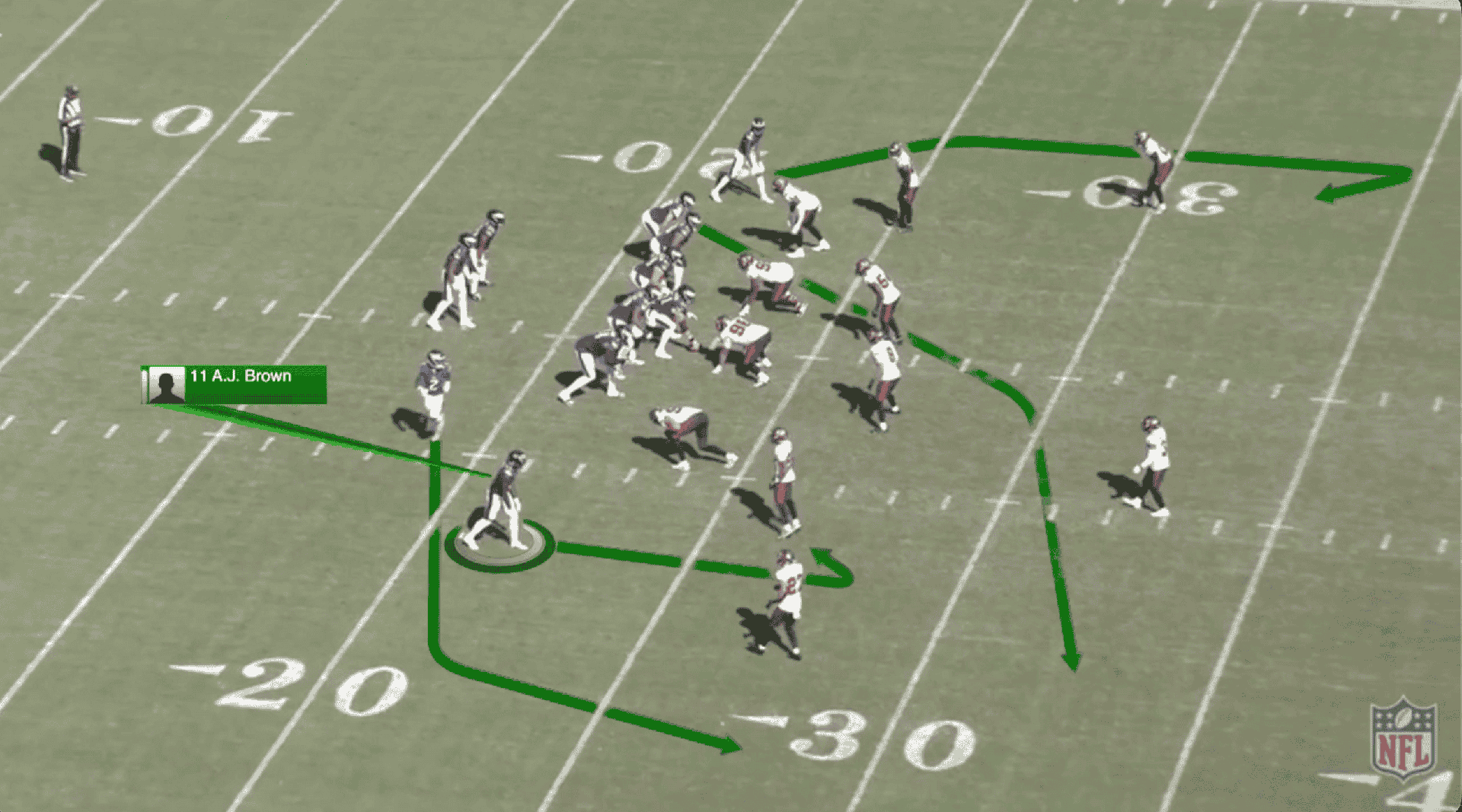Brown se alineó con una división apretada, y después de un movimiento del receptor, Brown esencialmente se convirtió en una ranura. Mover Brown alrededor de la formación es otra forma de tratar de conseguirle la pelota, pero esta no fue una jugada bien diseñada o bien ejecutada.