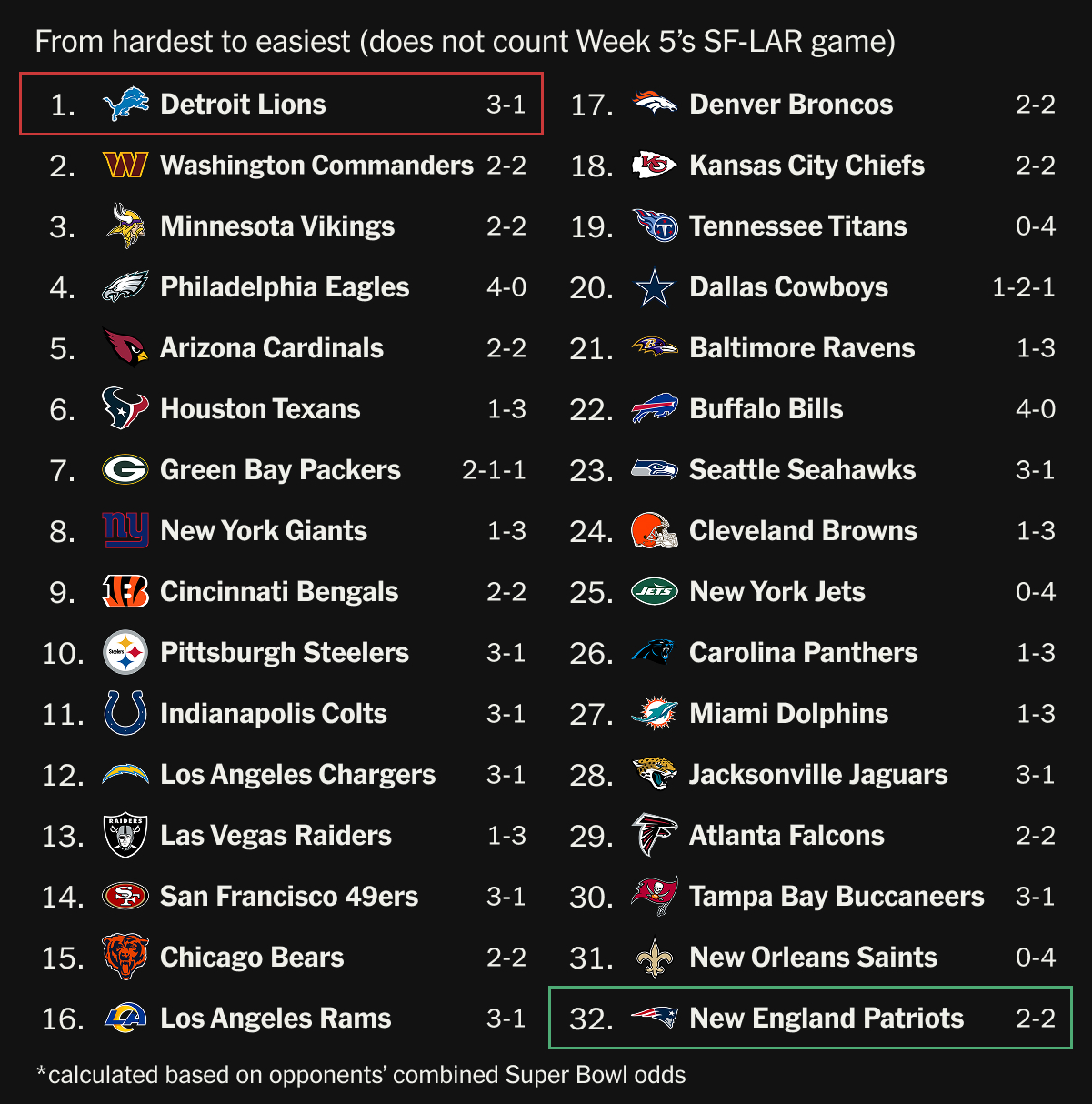 La vida ha sido buena para Josh Allen y los Bills 4-0. Basado en las probabilidades del Super Bowl de los oponentes a partir de ayer, el horario de Buffalo fue más de 10 veces más suave que el de las Eagles 4-0.