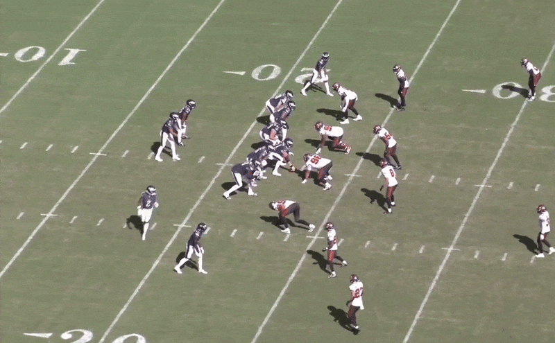 Los Buccaneers jugaron mucha cobertura de hombre en la primera mitad, pero habían cambiado a Zone durante toda la segunda mitad, cuando ocurrió esta jugada. En la primera mitad, Hurts completó 15 de 16 pases para 130 yardas y dos touchdowns. En la segunda mitad, fue 0 para 8.