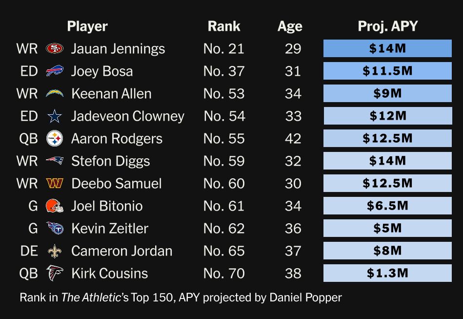 Es una buena manera de decir que la mayoría de ellos son viejos, al menos según los estándares de la NFL. Se trata casi exclusivamente de veteranos de edad avanzada que se acercan al ocaso de sus carreras. (Edad a partir de la Semana 1 de la próxima temporada. Los logotipos representan equipos anteriores).
