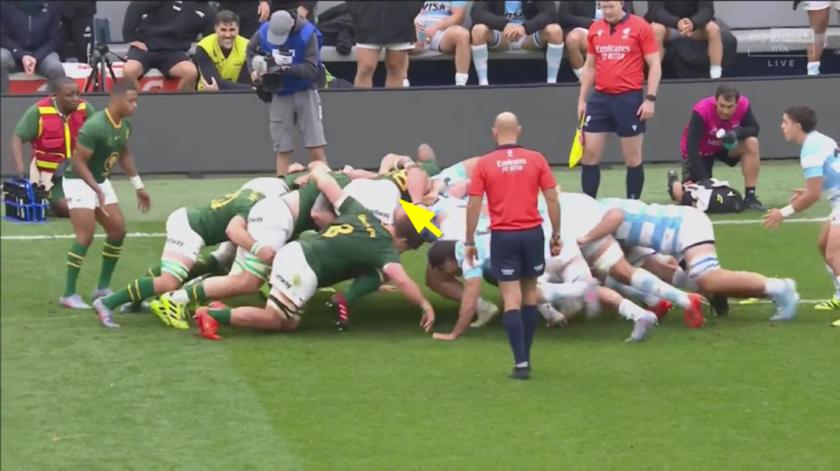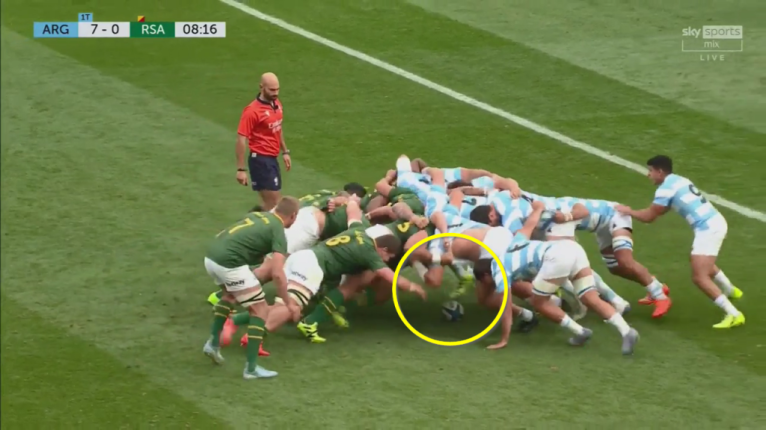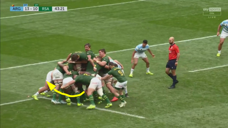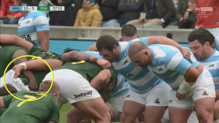 Pieter-Steph du Toit puede estar parado como el medio scrum de emergencia, pero siete delanteros sudafricanos son suficientes para expulsar a ocho argentinos del balón y Julián Montoya ni siquiera puede levantar el pie para atacar.