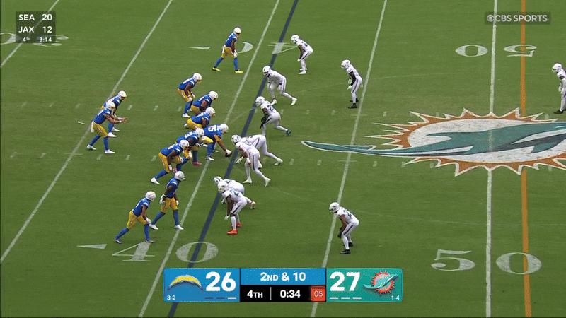 📈 Juego terrestre de los Chargers. La racha de dos derrotas consecutivas de Jim Harbaugh terminó con una victoria 29-27 en Miami, gracias en parte a otro corredor olvidado: el tercer estudiante de segundo año de Los Ángeles, Kimani Vidal. Realizó 21 toques para 138 yardas y un touchdown detrás de una línea ofensiva improvisada, lo que ayudó al juego aéreo de Justin Herbert. Luego, Herbert me hizo decir “Dang” en voz alta en mi sala de estar con esta obra: