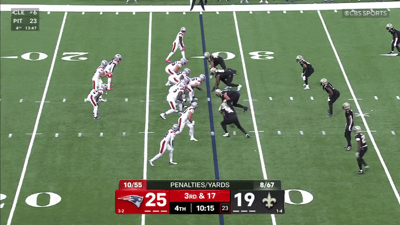 Fue la segunda penalización de este tipo impuesta contra Diggs, y la otra le costó a los Patriots 4-2 un touchdown largo. Aún así, Maye completó 18 de 26 pases para 261 yardas, tres touchdowns y ninguna intercepción en la victoria 25-19 contra New Orleans 1-5.