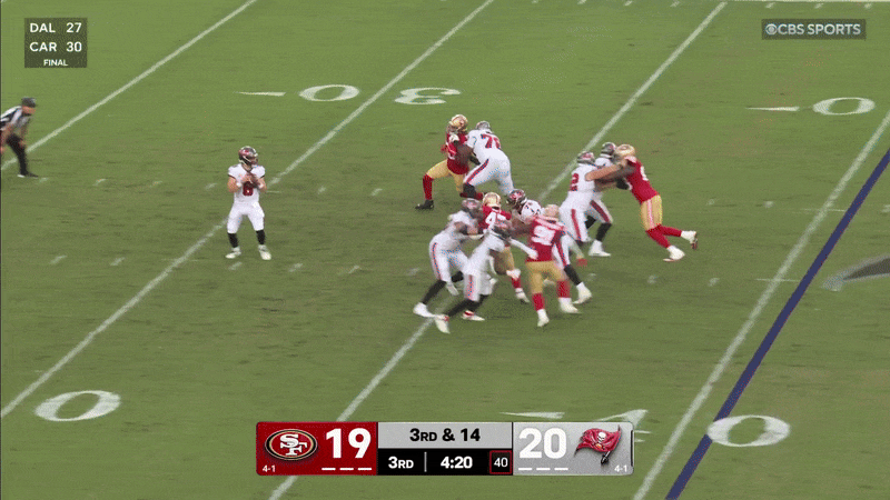 Lanzando principalmente a receptores de sexta y séptima fila, Mayfield completó 17 de 23 pases para 256 yardas y dos touchdowns sin intercepciones. A veces ni siquiera necesita receptores. Según NextGen Stats, tenía solo un 3,7 por ciento de posibilidades de convertir este tercero y 14:
