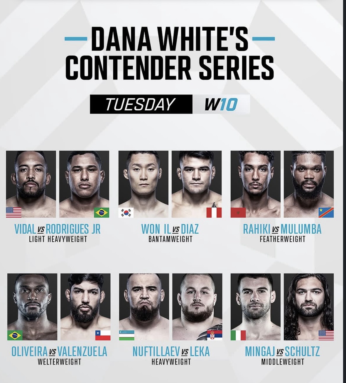 Wesley Schultz comenzó la velada con una fantástica sumisión ante su compañero especialista en terreno Mario Mingaj. Mingaj se puso en guardia contra la valla al principio del primer asalto, lo que dio lugar a algunos intercambios de lucha. Schultz aprovechó esta oportunidad para saltar sobre la espalda de Mingaj, pero en lugar de realizar el tradicional estrangulamiento trasero desnudo, realizó la extremadamente rara sumisión Suloev Stretch, que ataca el músculo de la ingle del oponente. Este fue el primer tramo de Suloev en la historia de DWCS, lo que le valió a Schultz el contrato en su segundo intento en el programa.